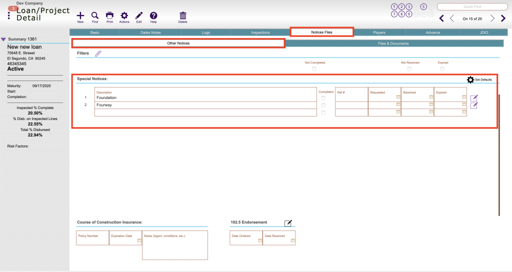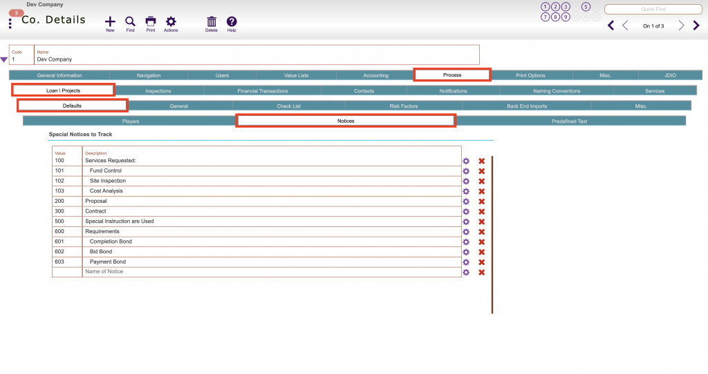 Any special notice or item for a project that you want to create and track for a project in the area below is created and set up at the company level: