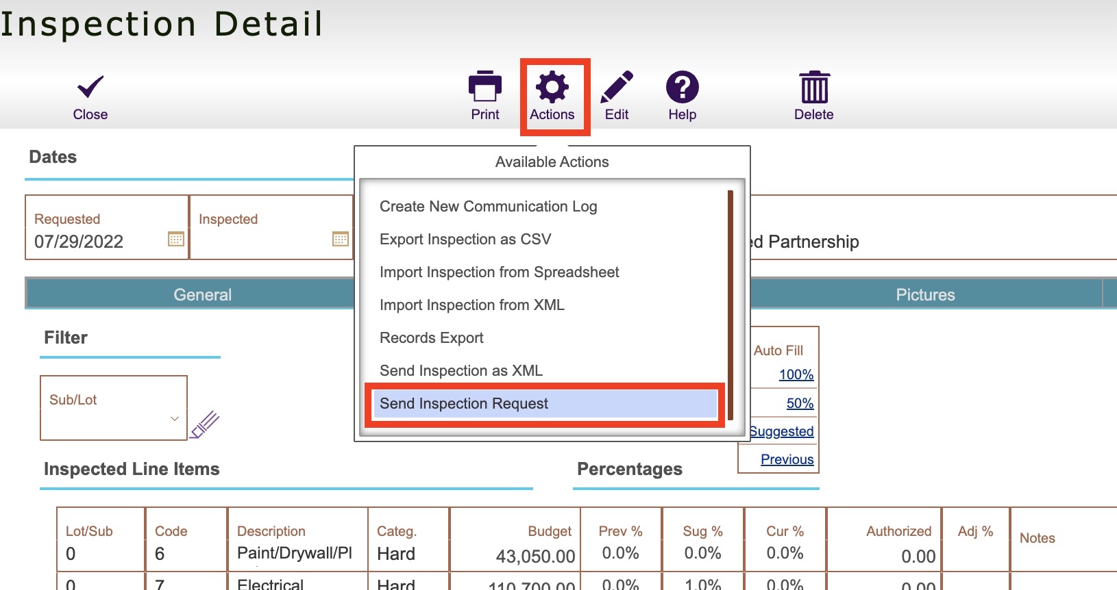 You can then click Actions > Send Inspection Request to send your inspection request to your inspector via email **Make sure your inspector contact for the project has an email address**