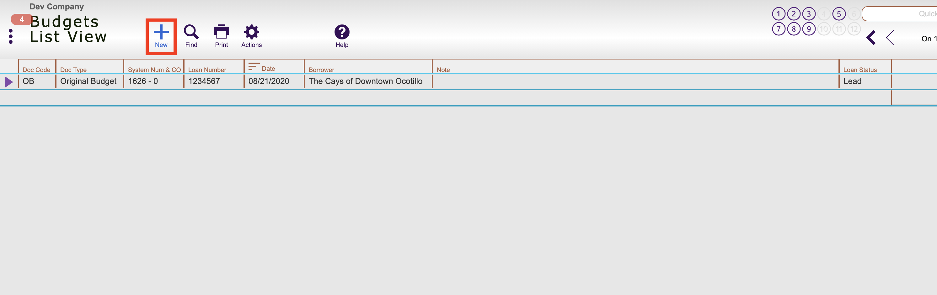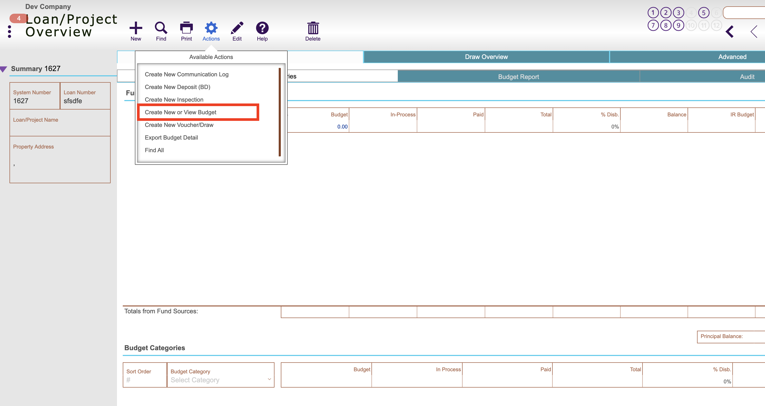 Navigate to Loans > Overview (pictured below) or Loans Detail screen of desired loan/project, click the Actions button and select Create or View Budget.