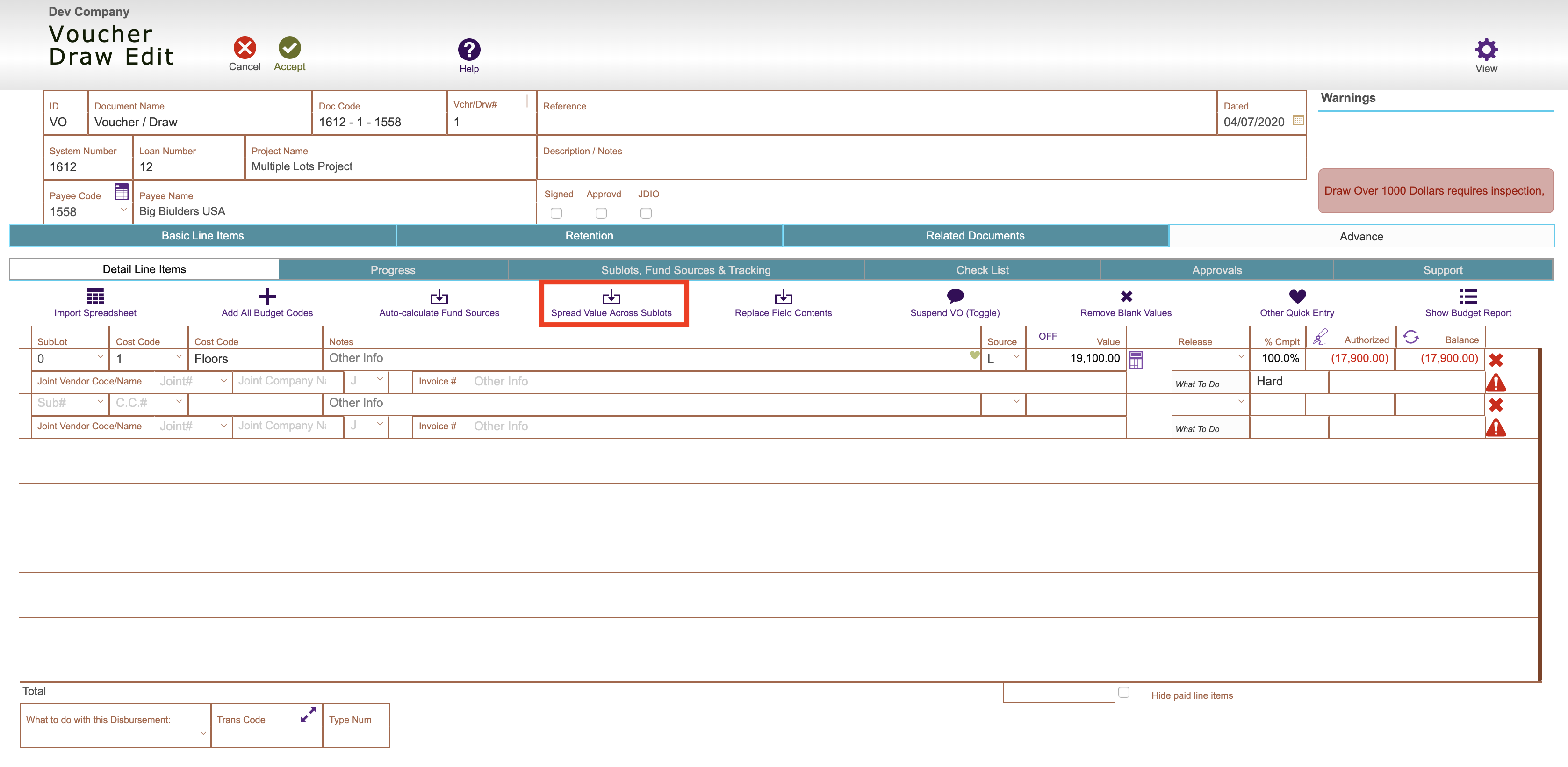 When editing a voucher/draw for a project that has multiple sub/lots in Fund Control you can click the Spread Value Across Sub/lots button you can use this feature