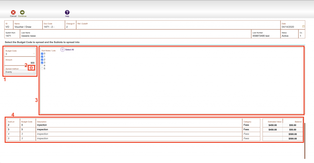 - Here is where you choose the Budget Code, Amount, and Spread Method across sub/lots